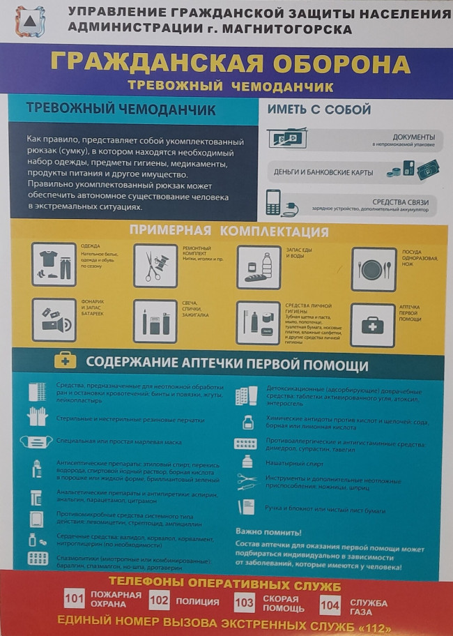 Управление гражданской защиты населения администрации г. Магнитогорска рекомендует подготовить «тревожный чемоданчик» — базовый набор вещей для выживания в экстремальных ситуациях до прибытия спасателей или эвакуации из зоны ЧС (землетрясение, наводнение, пожар и др.).