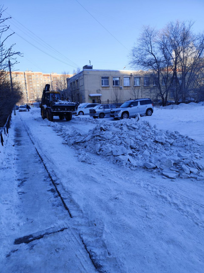 Сегодня с самого утра трактор работал на придомовой территории возле дома № 8/2 по улице Калмыкова.